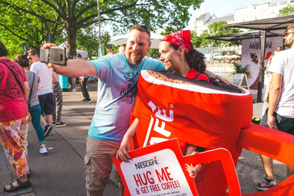 Passanten zu einer emotionalen Geste einzuladen, zum Lächeln zu bringen, damit für Kommunikation und Neues zu öffnen war der Ansatz. Als Vehikel dazu wurde, ausgehend von der Tatsache, dass auch 3000 Red Mugs verteilt werden sollten, ein Red Mug Kostüm geschaffen, das Nescafé Häferl quasi zum Leben erweckt. Mit dem einprägsamen und einfachen Slogan „Hug the Red Mug“ wurden die Passanten eingeladen, unseren NESCAFÉ Mug zu umarmen. Natürlich handelte es sich hierbei um einen Promotor, durch das Kostüm wurde aber jegliche Schwellenangst (wer herzt sonst so schnell einen wildfremden Menschen?) leicht überwunden, durch die Umarmung zugleich auch die natürliche Distanz durchbrochen. Derart „geöffnet“ und mit einem Lächeln im Gesicht wurden sie zu einer Tasse NESCAFÉ und einem Kaffeetratscherl mit anderen Menschen in das mobile Pop-Up NESCAFÉ Café eingeladen. An 4 Standorten (Wien, Graz, Linz) wurden innerhalb von 12 Tagen, 250.000 Kontakte generiert, 3000 Mugs (First Come First Serve, via Facebook ausgelobt) ausgegeben, etliche Selfies mit dem Mug gemacht, auf Facebook geteilt und 16.200 Menschen kamen der Einladung, den Mug zu umarmen und gemeinsam einen NESCAFÉ zu genießen, nach. Und wer weiß wieviel Neues hier gestartet wurde – Uni Projekte, Kooperationen, Freundschaften? It all starts with a NESCAFÉ…