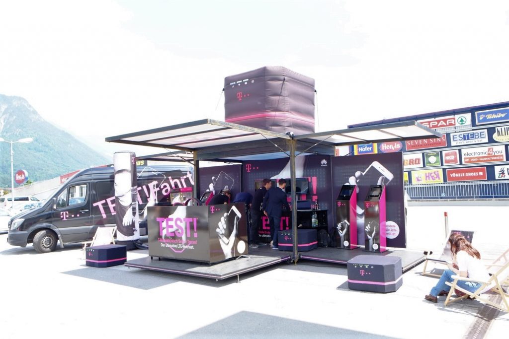 1. dem LTE Info Cube – natürlich 100% im neuen T-Mobile Corporate Design und mit einer überdimensionierten T-Mobile Home Net Box am Dach als Eyecatcher ausgestattet. Natürlich gab es in dem LTE Info-Cube auch sichere und schnelle LTE-Hotspots. Der Cube war dank ausgeklügelter Mechanik, bei aller Hochwertigkeit und Stabilität schnell und einfach aufzubauen. Ein autarkes Strom-Akkusystem ermöglichte auch Standorte ohne direktem Stromzugang.